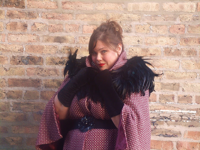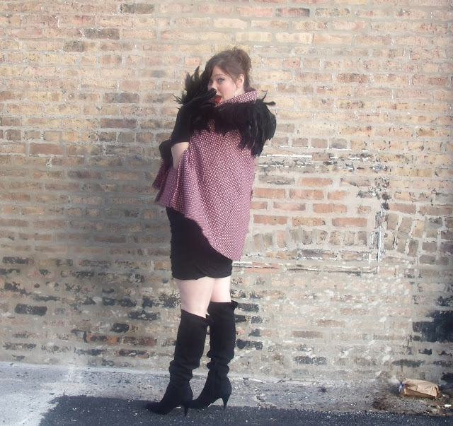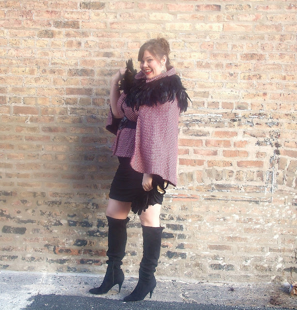 It was so fun to wear a feather cape over an LBD and rock the GLAM-A, but honestly, it is a little predictable. So, Curvatude and I challenged ourselves to figure out 2 other ways to wear a feather cape. Living in Chicago means we are usually wearing coats of some sort…so we added the feather cape as an extra ridiculously awesome cold weather accessory.