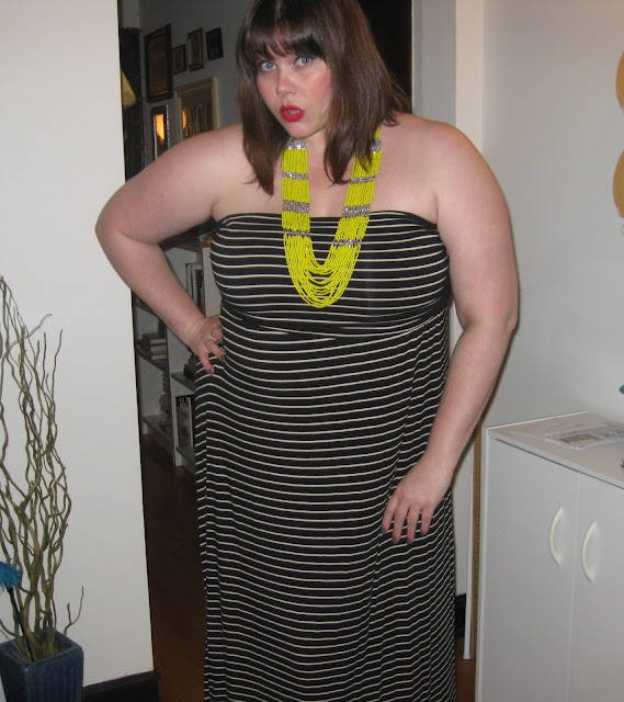Outfit details: Kiyonna Chameleon Convertible Dress via vive la femme; yellow statement necklace Brazil collection via Macy’s; Zen Knits black wrap via vive la femme; Green and gold chain necklace via Nordstrom Rack; Egg shaped pendant via Jewelmint.