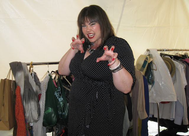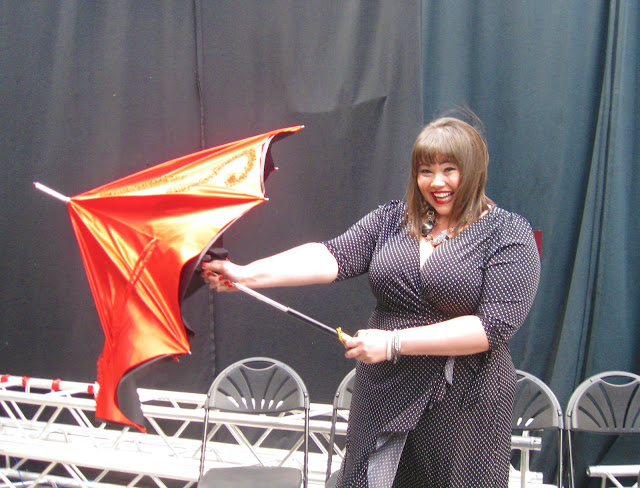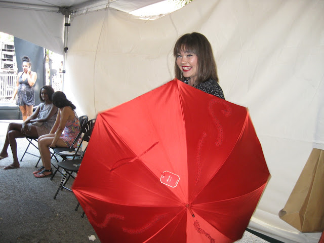 I appeared in the afternoon show representing vive la femme and wore the fantastic Kiyonna Whimsy Wrap Dress. I paired it with my own hot red heels, and an amazing red parasol from Elevensees. Even though it was a swelteringly hot day…it was a blast. I’m so glad I got to participate and spend the day as a model. 🙂