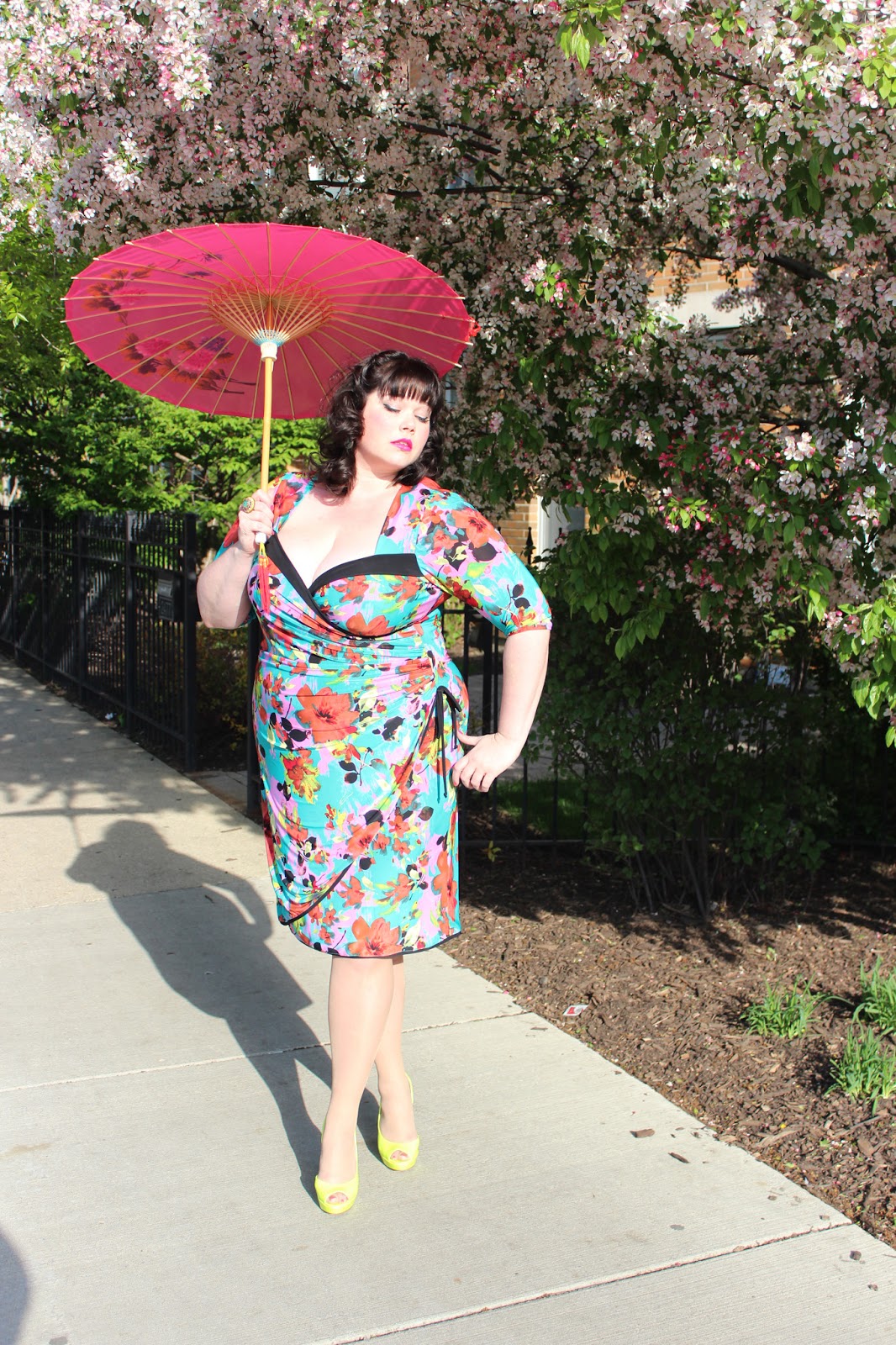 This is a classic Kiyonna faux-wrap dress with a little side ruching and black piping for details. The open sweetheart neckline with the black lapel-like trim create a gorgeous vintage frame for your decolletage. 🙂 The bright floral print is completely on trend for the season, and who doesn’t love a 3/4 sleeve?
