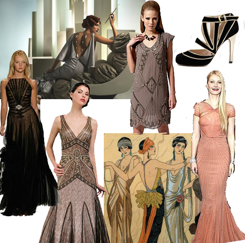If you know me, you know that I don’t do things half way…and I simply adore a good theme party!! So…I was thrilled when two of my awesome friends got married last month, with an Art Deco theme. Art Deco is all about glamour, metallics, and linear symmetry…and it shows up in everything from the art, architecture, jewelry, cars, and of course, the fashion of the time. When I was looking for the perfect dress, I was inspired by images like these…