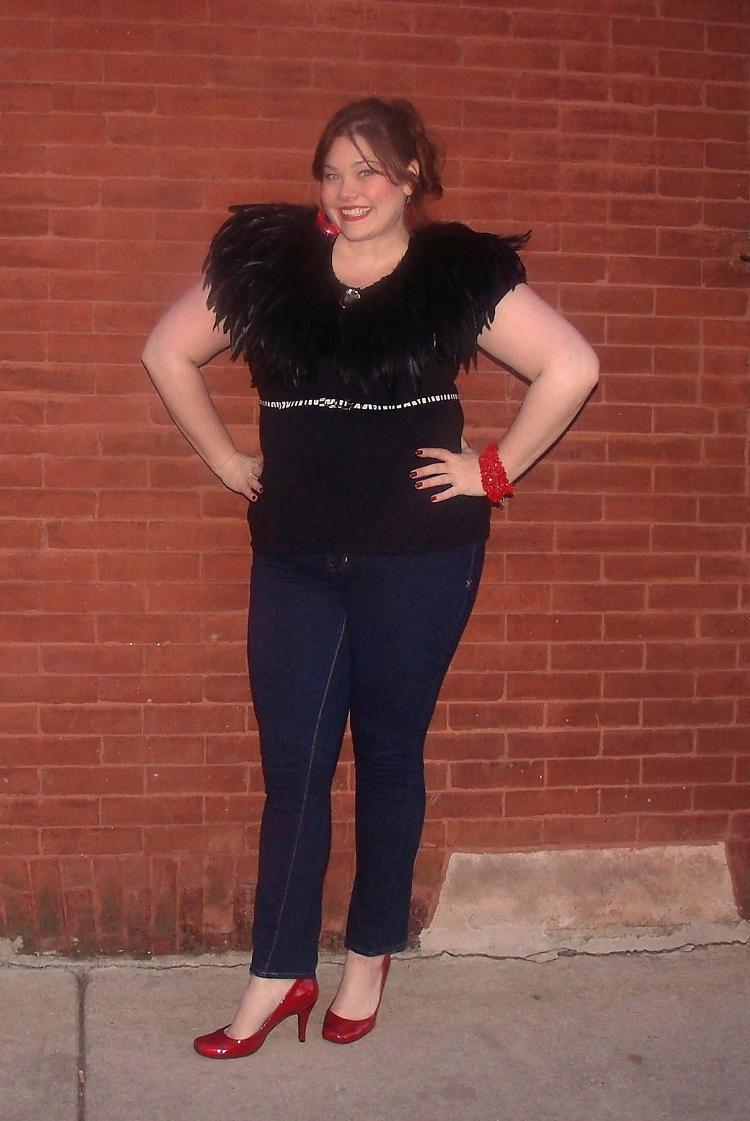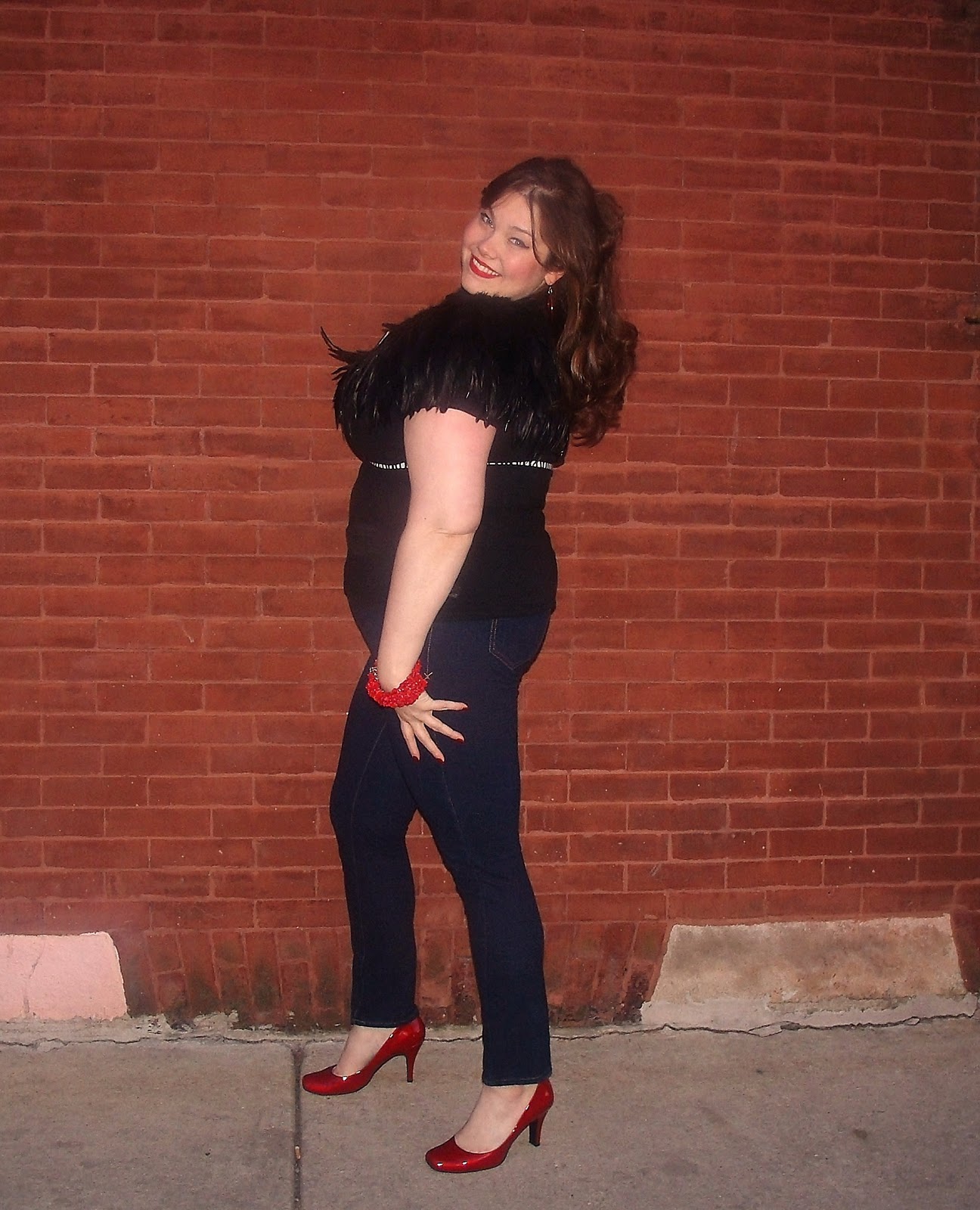Feather Cape: Forever 21, Skinny Jeans: Lane Bryant, Black V-neck T: Old Navy, Zebra Skinny Belt: Dressbarn Woman; Red High Heels: Me Too via Nordstrom Rack, Jewelry: Francesca’s.