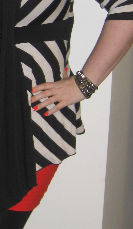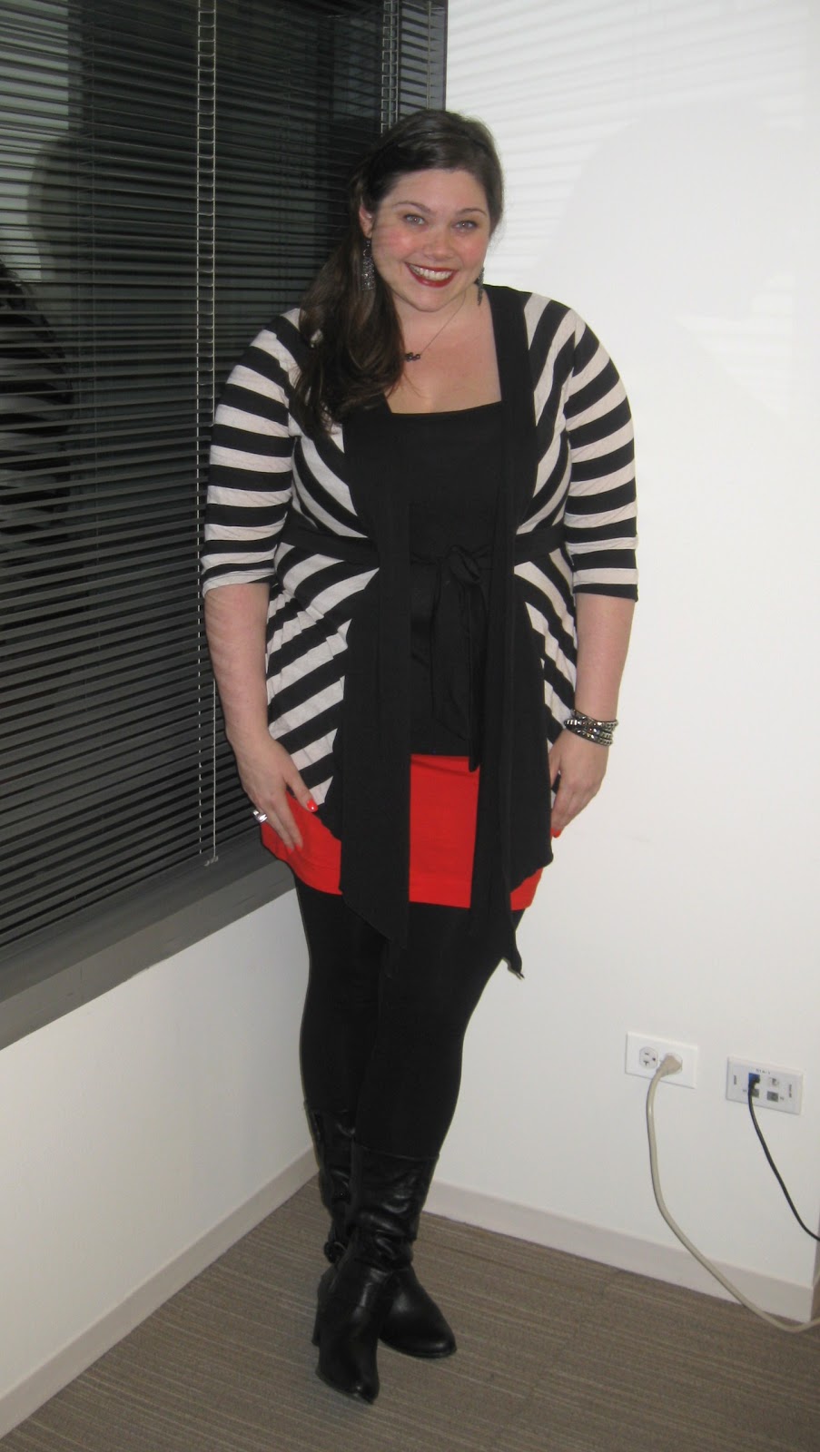Who says big girls can’t wear mini skirts??? Not me! I rocked this bright orange mini from H&M (size L) in the office last week. Paired with some black leggings from Lane Bryant, awesome low-heeled slouchy boots from violette shoe salon, and a black and white striped top via TJ Maxx, this somewhat daring mini was transformed into a sassy, yet work-appropriate outfit.
