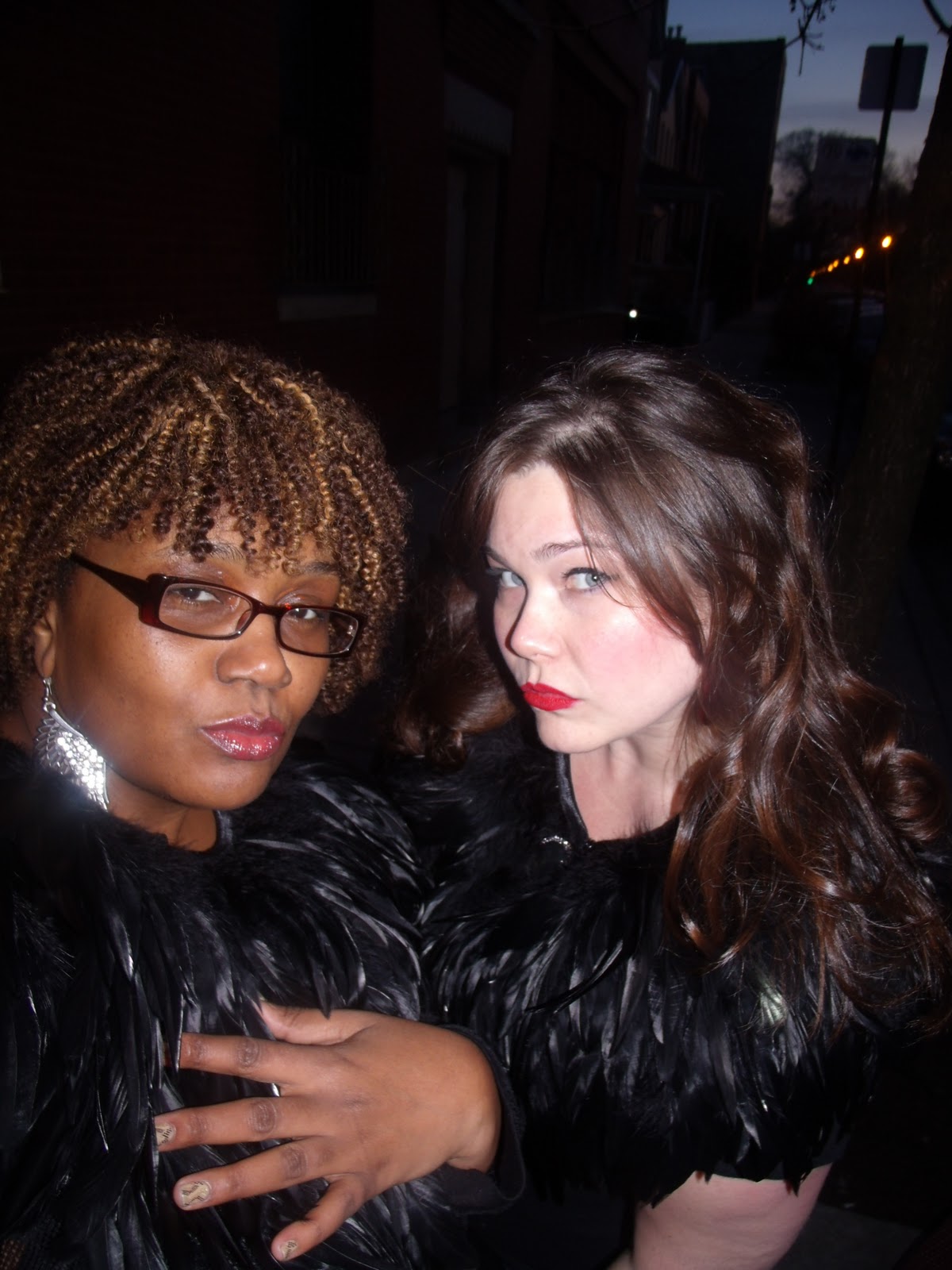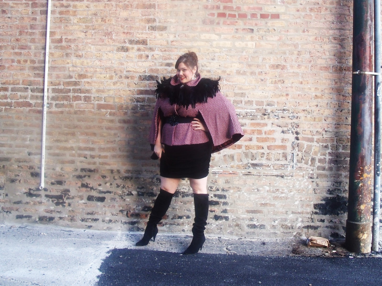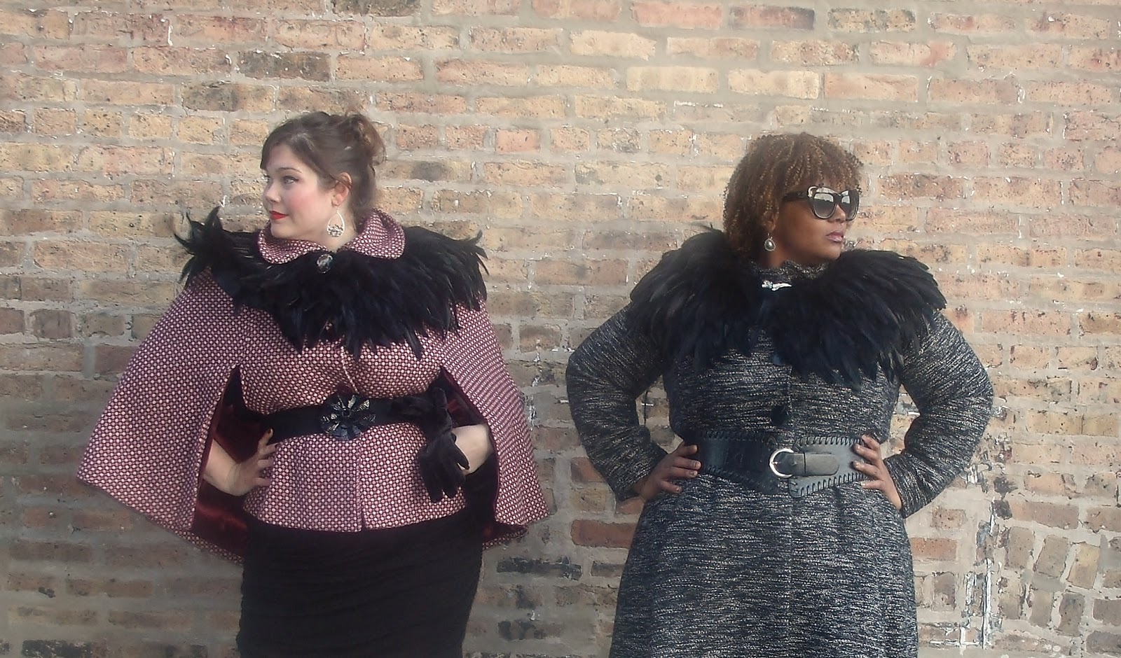 It was so fun to wear a feather cape over an LBD and rock the GLAM-A, but honestly, it is a little predictable. So, Curvatude and I challenged ourselves to figure out 2 other ways to wear a feather cape. Living in Chicago means we are usually wearing coats of some sort…so we added the feather cape as an extra ridiculously awesome cold weather accessory.