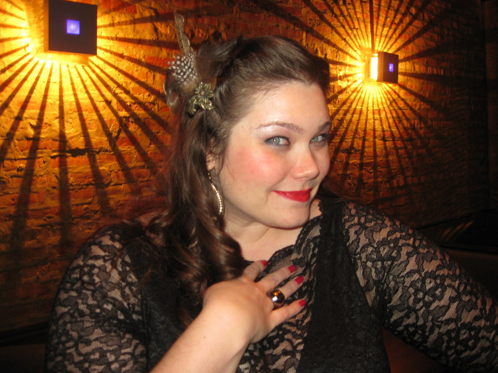 I went for a vintage-y hairstyle and added a feathered brooch that my friend Michelle gave me. It’s from the 80s, and I LOVE it!