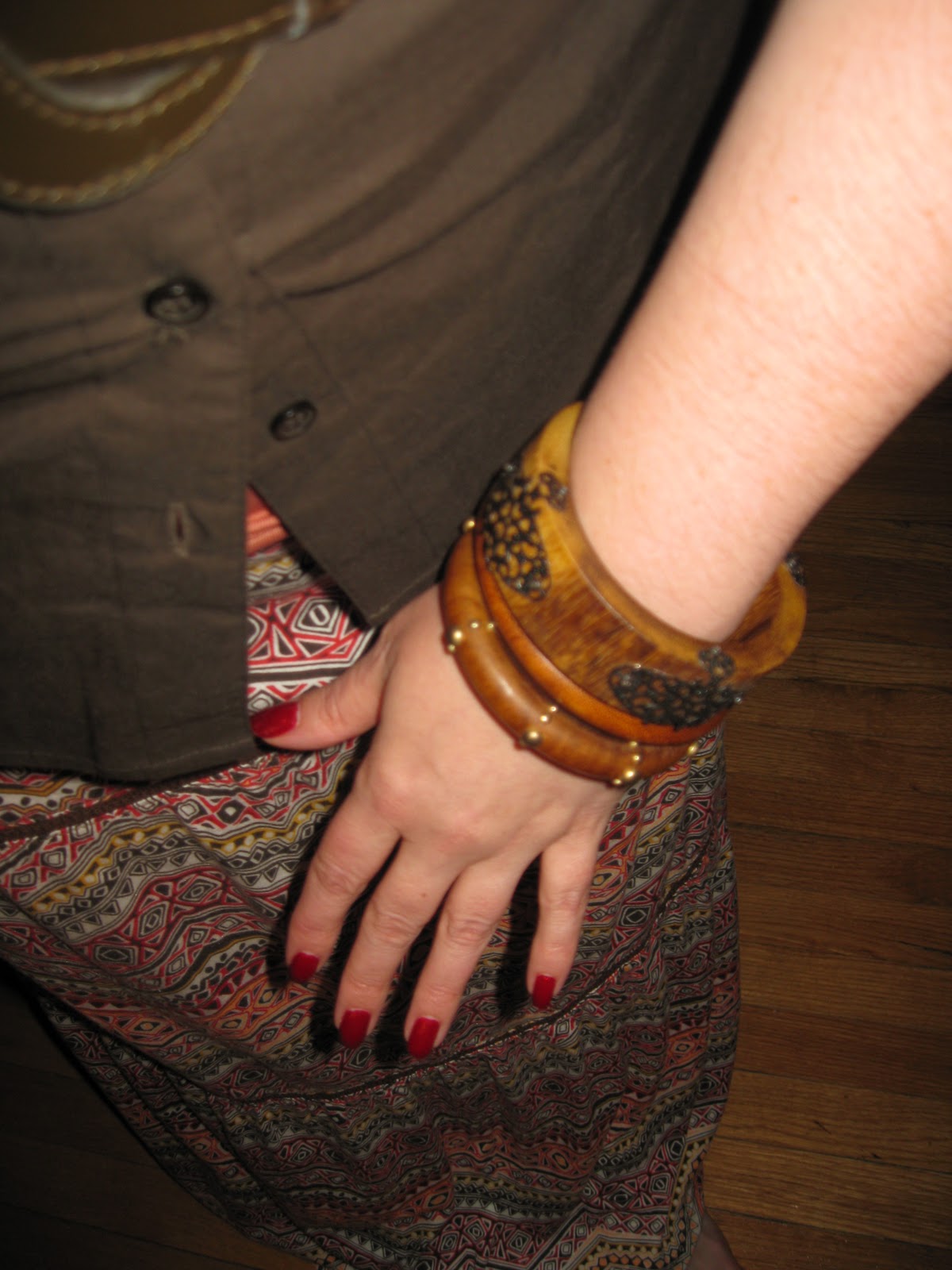 | Wooden bangles carry the theme through…the two lower ones are vintage and were given to me by my awesome friend Michelle. The top bangle with the metal detailing was bought at a flea market ages ago. |