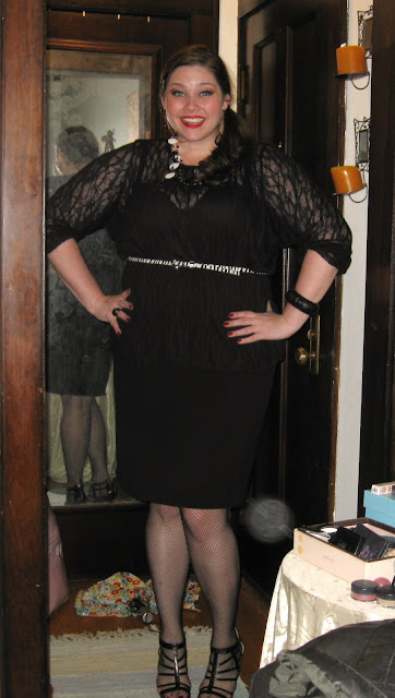 This outfit was perfect for the weather (which was gross and rainy and cold)! It was also easy to transition from day (as in office) to night. During the day, I wore a modest tank top under the sweater and plain black heels. To vavoom-it-up, I changed into a body suit and fishnets, and added my cage shoes from Nine West. The chunky black and white statement necklace and the zebra skinny belt added some pop to the outfit. Everyone kept saying that they loved my “dress,” so I guess it blended so well together that they couldn’t tell it was three separate pieces. 🙂