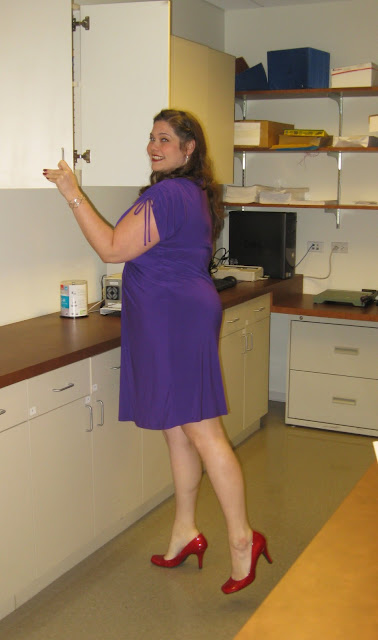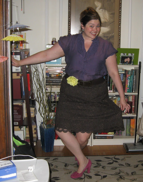 This purple shirt is just a tad sheer, but is still appropriate enough to wear to the office (at least I thought it was). I went with a wildcard pairing of magenta suede heels…but it still felt somewhat boring until I added this yellow fabric flower to the belt. It definitely added some zing to the outfit…and drew attention away from my un-makeup-ed (I just invented that word) face and blah hairdo. 🙂