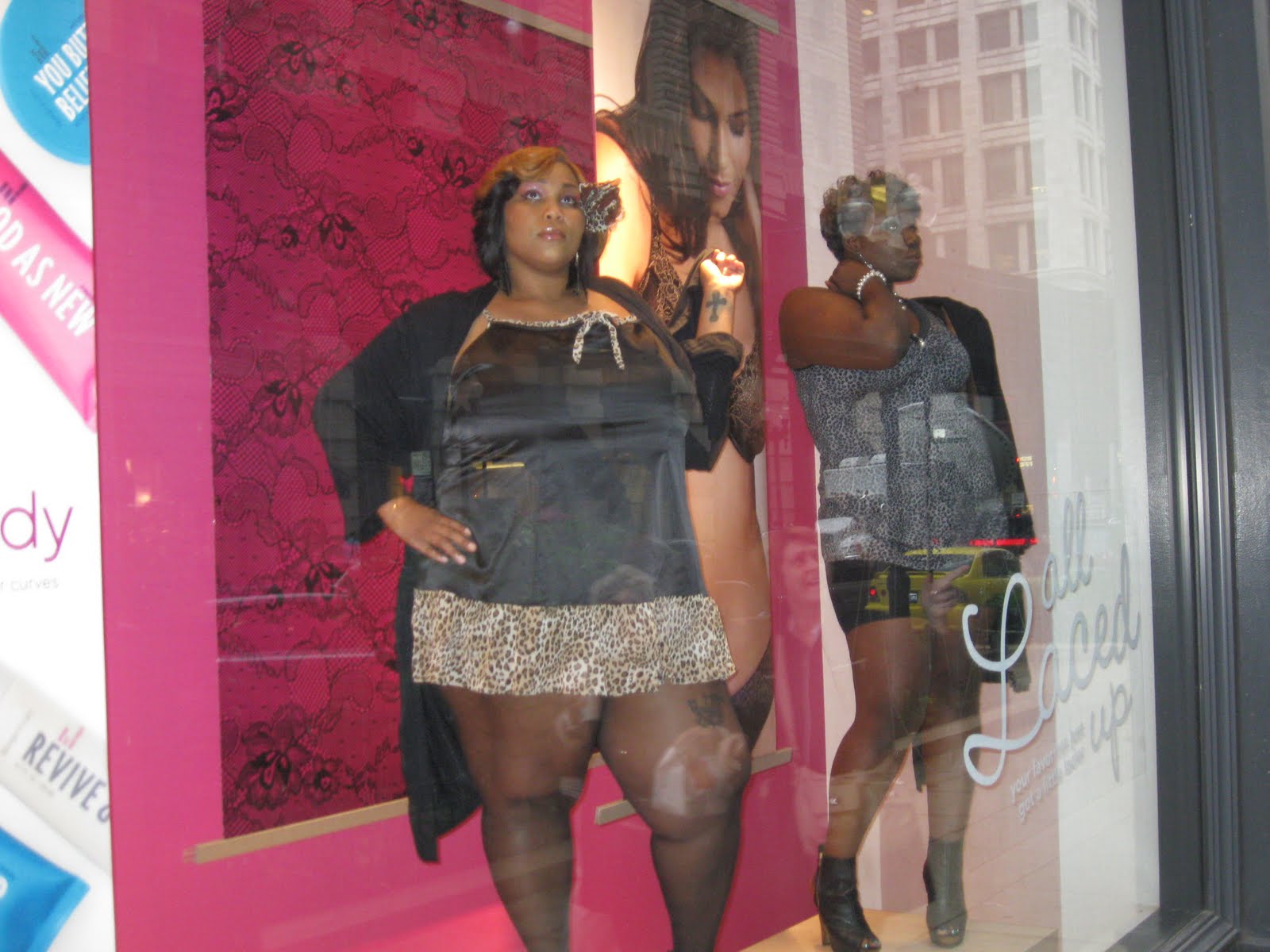 I got out of work at 5:30 and even though I didn’t see anything advertised at Lane Bryant, I decided to stop there first. They didn’t have any shopping discounts or anything like that, but I was pleasantly surprised that they had live models in the windows of the Chicago store! The gorgeous models attracted quite a crowd, and I think it was a success. Maybe next year, they’ll do something more for FNO, but this was a good start. Here are a couple of not-so-great pictures of the live windows at Lane Bryant in Chicago.