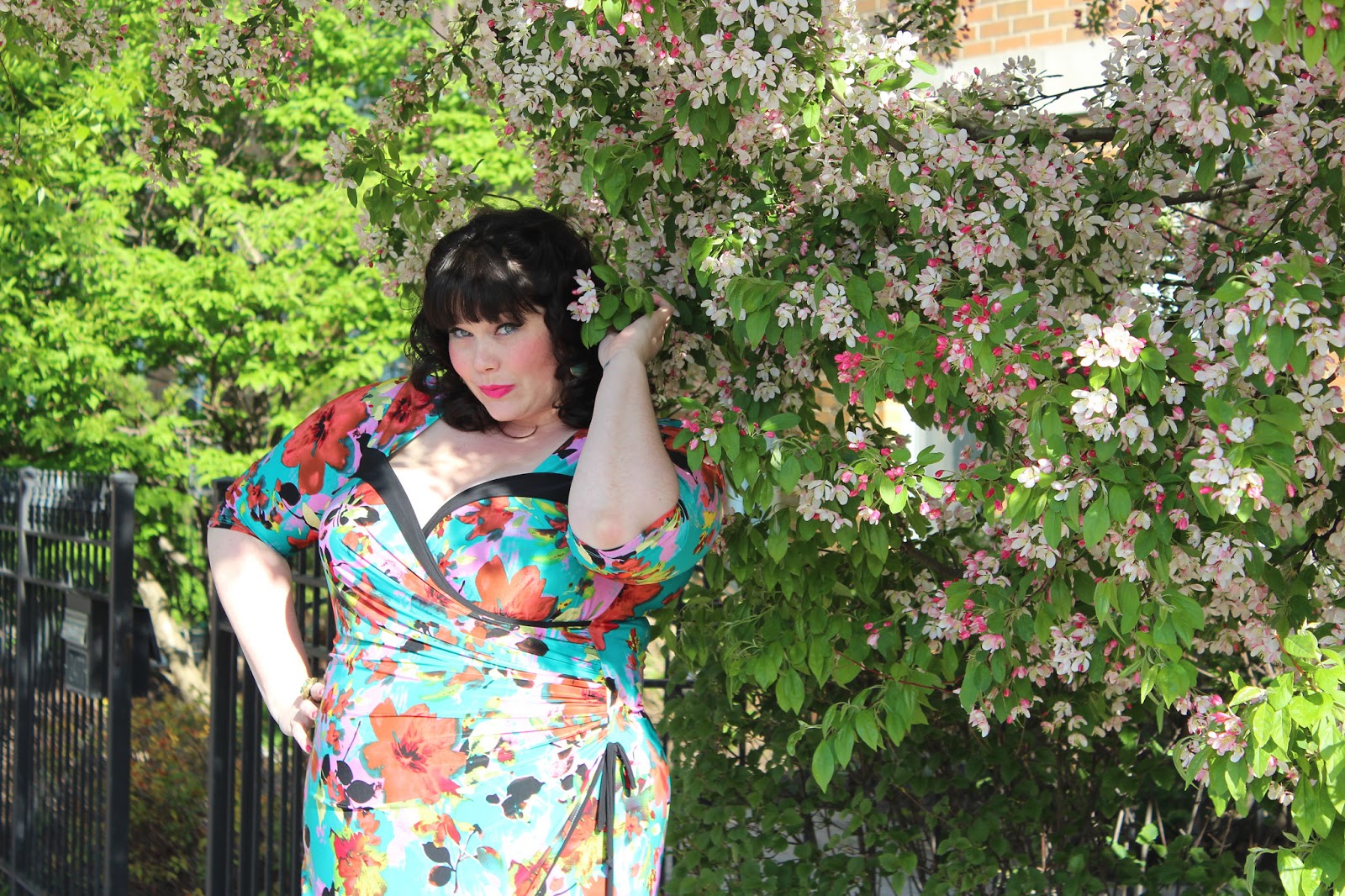 This is a classic Kiyonna faux-wrap dress with a little side ruching and black piping for details. The open sweetheart neckline with the black lapel-like trim create a gorgeous vintage frame for your decolletage. 🙂 The bright floral print is completely on trend for the season, and who doesn’t love a 3/4 sleeve?
